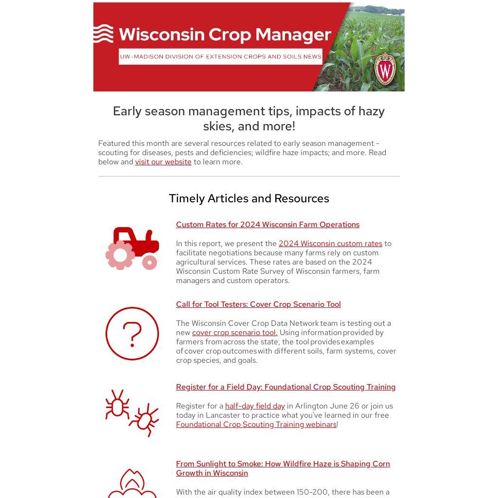Featured this month are several resources related to early season management - scouting for diseases, pests and deficiencies; wildfire haze impacts; and more. Read below and visit our website to learn more.