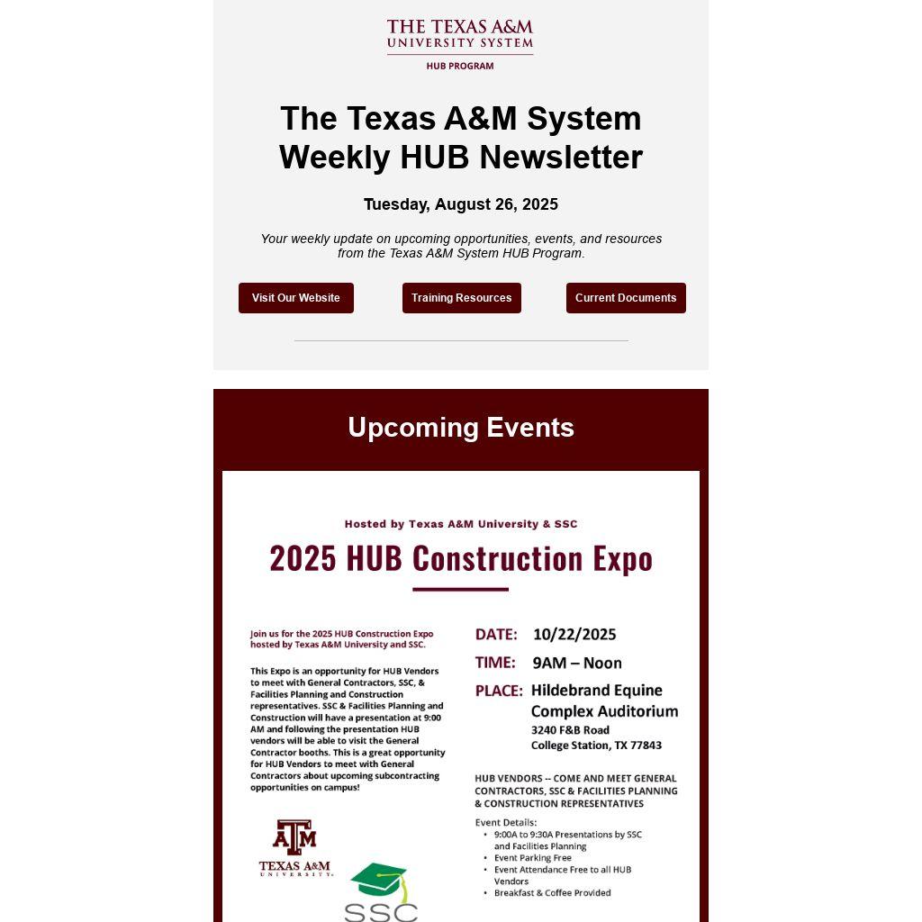 Your weekly update on upcoming opportunities, events, and resources from the Texas A&M System HUB Program.