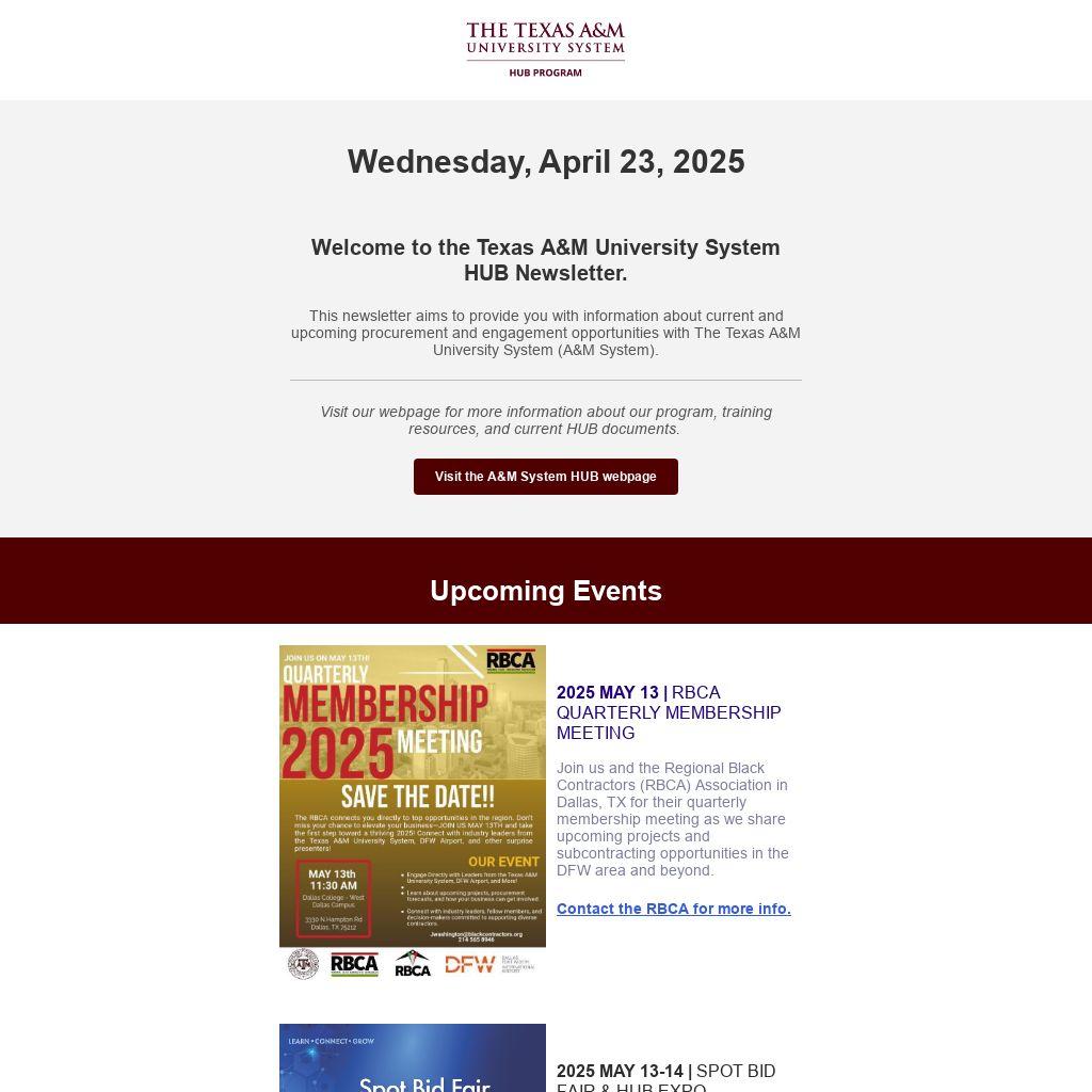 Welcome to the Texas A&M University System HUB Newsletter. |