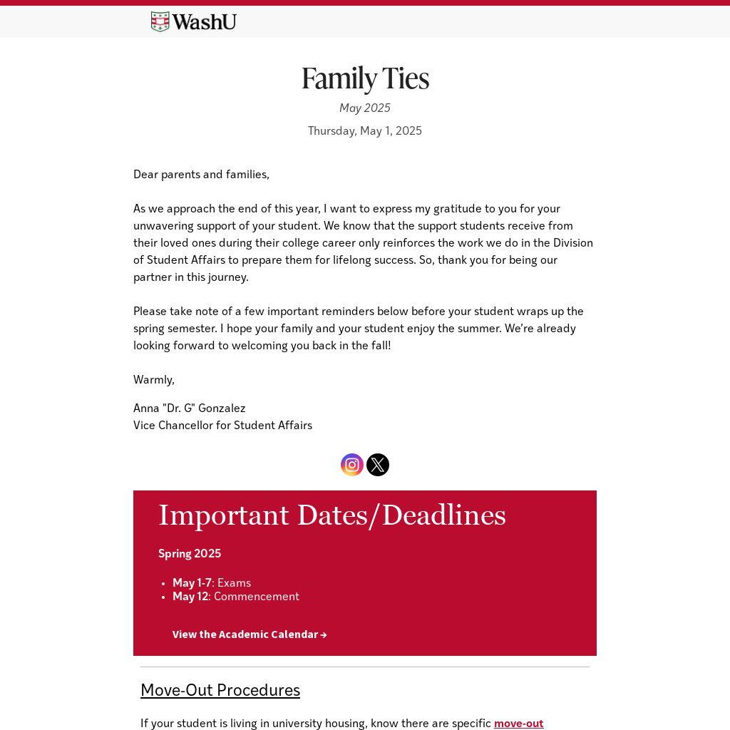 If your student is living in university housing, know there are specific move-out procedures they must follow. The last day to check-out for non-graduating students is Thursday, May 8. May 8 is a very busy day on campus, so we encourage you and your student to have a move-out plan to ensure the process goes smoothly.