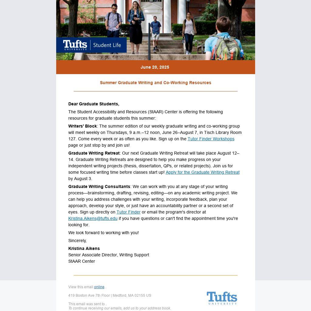 Graduate Writing Consultants: We can work with you at any stage of your writing process—brainstorming, drafting, revising, editing—on any academic writing project. We can help you address challenges with your writing, incorporate feedback, plan your approach, develop your style, or just have an accountability partner or a second set of eyes. Sign up directly on Tutor Finder or email the program's director at Kristina.Aikens@tufts.edu if you have questions or can't find the appointment time you're looking for.
