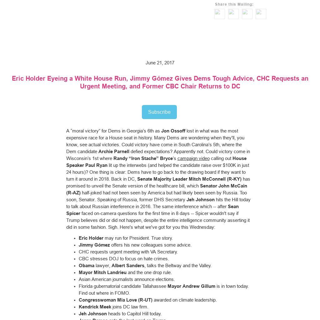 A “moral victory” for Dems in Georgia’s 6th as Jon Ossoff lost in what was the most expensive race for a House seat in history. Many Dems are wondering when they'll, you know, see actual victories. Could victory have come in South Carolina’s 5th, where the Dem candidate Archie Parnell defied expectations? Apparently not. Could victory come in Wisconsin’s 1st where Randy “Iron Stache” Bryce’s campaign video calling out House Speaker Paul Ryan lit up the interwebs (and helped the candidate raise over $100K in just 24 hours)? One thing is clear: Dems have to go back to the drawing board if they want to turn it around in 2018. Back in DC, Senate Majority Leader Mitch McConnell (R-KY) has promised to unveil the Senate version of the healthcare bill, which Senator John McCain (R-AZ) half-joked had not been seen by America but had likely been seen by Russia. Too soon, Senator. Speaking of Russia, former DHS Secretary Jeh Johnson hits the Hill today to talk about Russian interference in 2016. The same interference which -- after Sean Spicer faced on-camera questions for the first time in 8 days -- Spicer wouldn't say if Trump believes did or did not happen, despite the entire intelligence community asserting it did in some fashion. Sigh. Here's what we've got for you this Wednesday:
