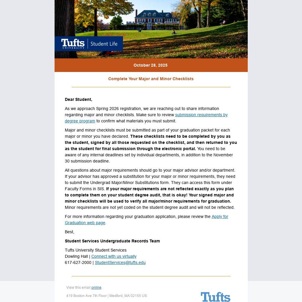As we approach Spring 2026 registration, we are reaching out to share information regarding major and minor checklists. Make sure to review submission requirements by degree program to confirm what materials you must submit.