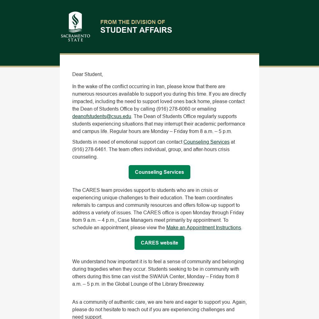 We understand how important it is to feel a sense of community and belonging during tragedies when they occur. Students seeking to be in community with others during this time can visit the SWANA Center, Monday – Friday from 8 a.m. – 5 p.m. in the Global Lounge of the Library Breezeway.