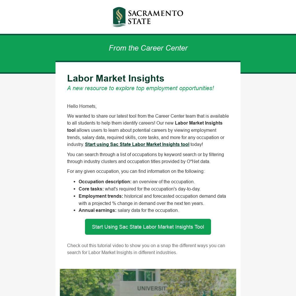 We wanted to share our latest tool from the Career Center team that is available to all students to help them identify careers! Our new Labor Market Insights tool allows users to learn about potential careers by viewing employment trends, salary data, required skills, core tasks, and more for any occupation or industry. Start using Sac State Labor Market Insights tool today!