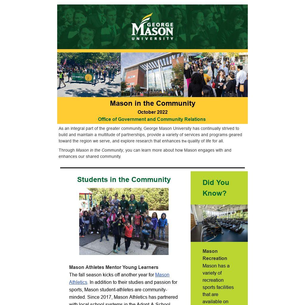 Mason Athletes Mentor Young LearnersThe fall season kicks off another year for Mason Athletics. In addition to their studies and passion for sports, Mason student-athletes are community-minded. Since 2017, Mason Athletics has partnered with local school systems in the Adopt-A-School Program, a collaborative mentor/volunteer community service initiative. Athletes mentor, coach, tutor, encourage, and engage with students in grades K-6 academically, athletically, and socially. The program received a Jack Wood Award for Town-Gown Relations in 2020. Learn more.