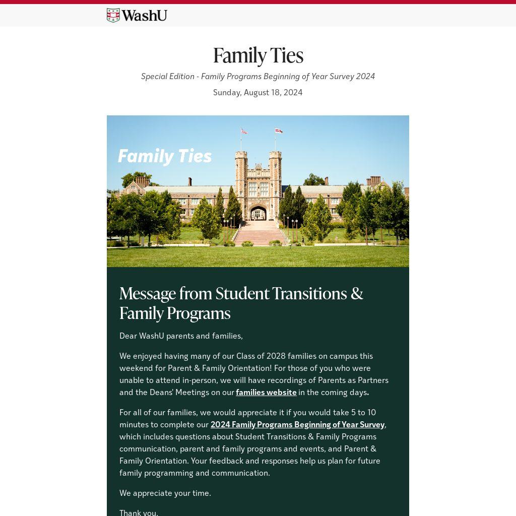 For all of our families, we would appreciate it if you would take 5 to 10 minutes to complete our 2024 Family Programs Beginning of Year Survey, which includes questions about Student Transitions & Family Programs communication, parent and family programs and events, and Parent & Family Orientation. Your feedback and responses help us plan for future family programming and communication.
