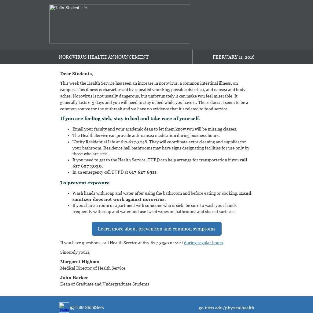This week the Health Service has seen an increase in norovirus, a common intestinal illness, on campus. This illness is characterized by repeated vomiting, possible diarrhea, and nausea and body aches. Norovirus is not usually dangerous, but unfortunately it can make you feel miserable. It generally lasts 2-3 days and you will need to stay in bed while you have it. There doesn't seem to be a common source for the outbreak and we have no evidence that it's related to food service.