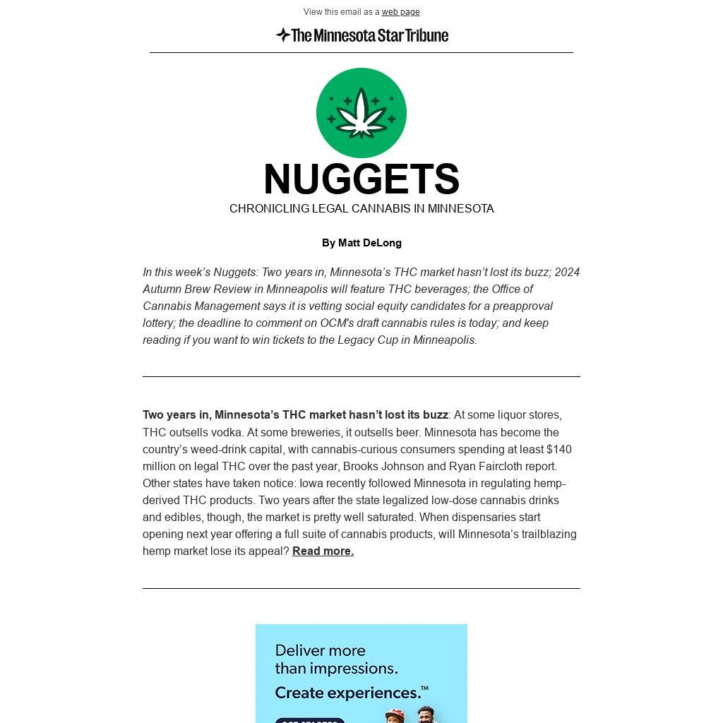 In this week’s Nuggets: Two years in, Minnesota’s THC market hasn’t lost its buzz; 2024 Autumn Brew Review in Minneapolis will feature THC beverages; the Office of Cannabis Management says it is vetting social equity candidates for a preapproval lottery; the deadline to comment on OCM's draft cannabis rules is today; and keep reading if you want to win tickets to the Legacy Cup in Minneapolis.
