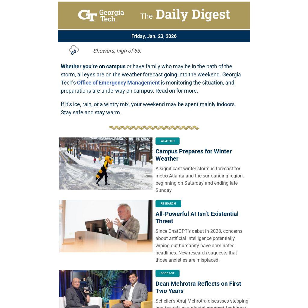 Whether you’re on campus or have family who may be in the path of the storm, all eyes are on the weather forecast going into the weekend. Georgia Tech’s Office of Emergency Management is monitoring the situation, and preparations are underway on campus. Read on for more.