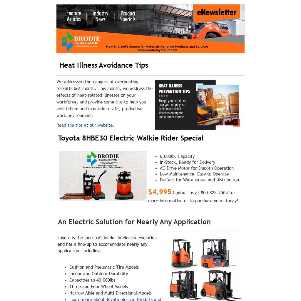 We addressed the dangers of overheating forklifts last month. This month, we address the effects of heat-related illnesses on your workforce, and provide some tips to help you avoid them and maintain a safe, productive work environment.