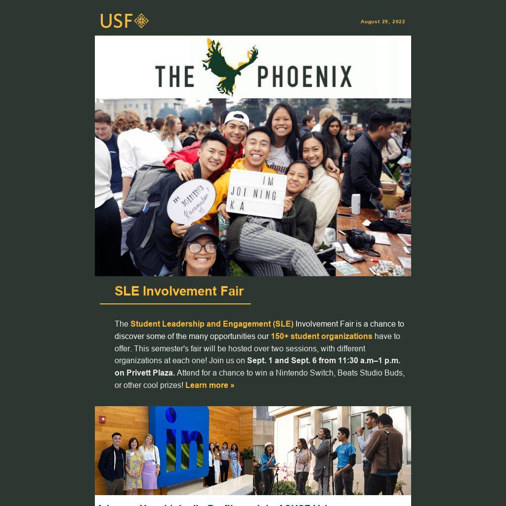 The Phoenix is a weekly e-newsletter sent by Student Leadership and Engagement to help students stay connected and get involved. It features campus events, leadership opportunities, athletic games, workshops, retreats, and more. Why “The Phoenix” title? The Phoenix has long been associated with the history and growth of USF as well as St. Ignatius, who encouraged followers to “go forth and set the world on fire.” Learn more »