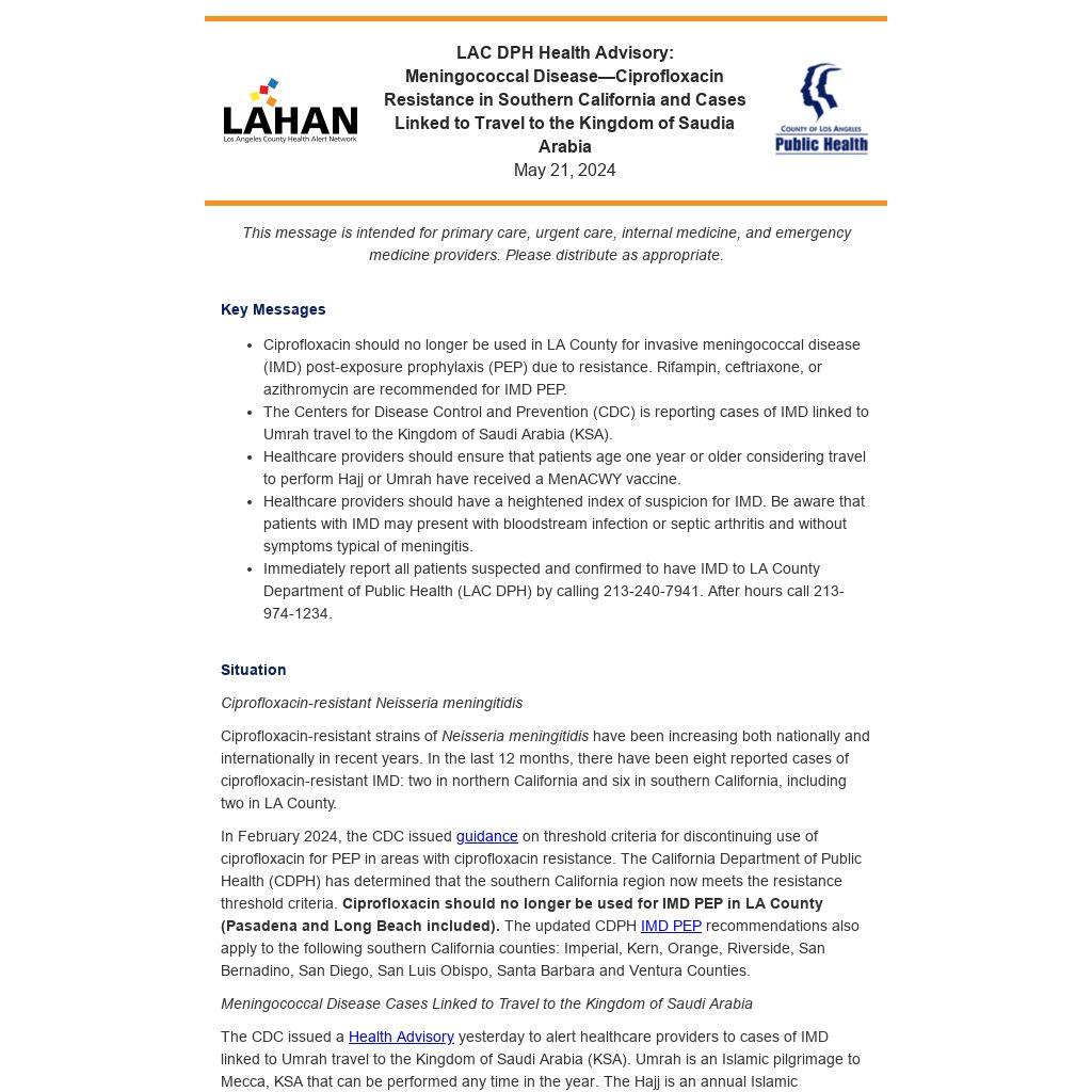 In February 2024, the CDC issued guidance on threshold criteria for discontinuing use of ciprofloxacin for PEP in areas with ciprofloxacin resistance. The California Department of Public Health (CDPH) has determined that the southern California region now meets the resistance threshold criteria. Ciprofloxacin should no longer be used for IMD PEP in LA County (Pasadena and Long Beach included). The updated CDPH IMD PEP recommendations also apply to the following southern California counties: Imperial, Kern, Orange, Riverside, San Bernadino, San Diego, San Luis Obispo, Santa Barbara and Ventura Counties.