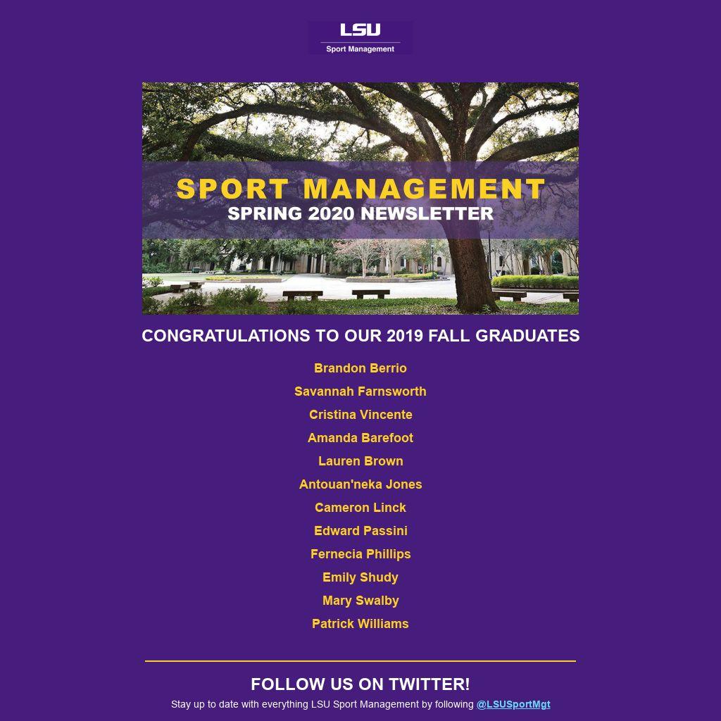 Over the past several years, we have experienced combined growth in our LSU Sport Management program – both on-campus and online. We are currently accepting students for the Fall of 2020. If you know individuals interested in a master’s degree from LSU and in Sport Management, encourage them to contact Dr. Mike Martinez, Director of Online Programs for Kinesiology or Dr. Chad Seifried at for the on-campus opportunity.