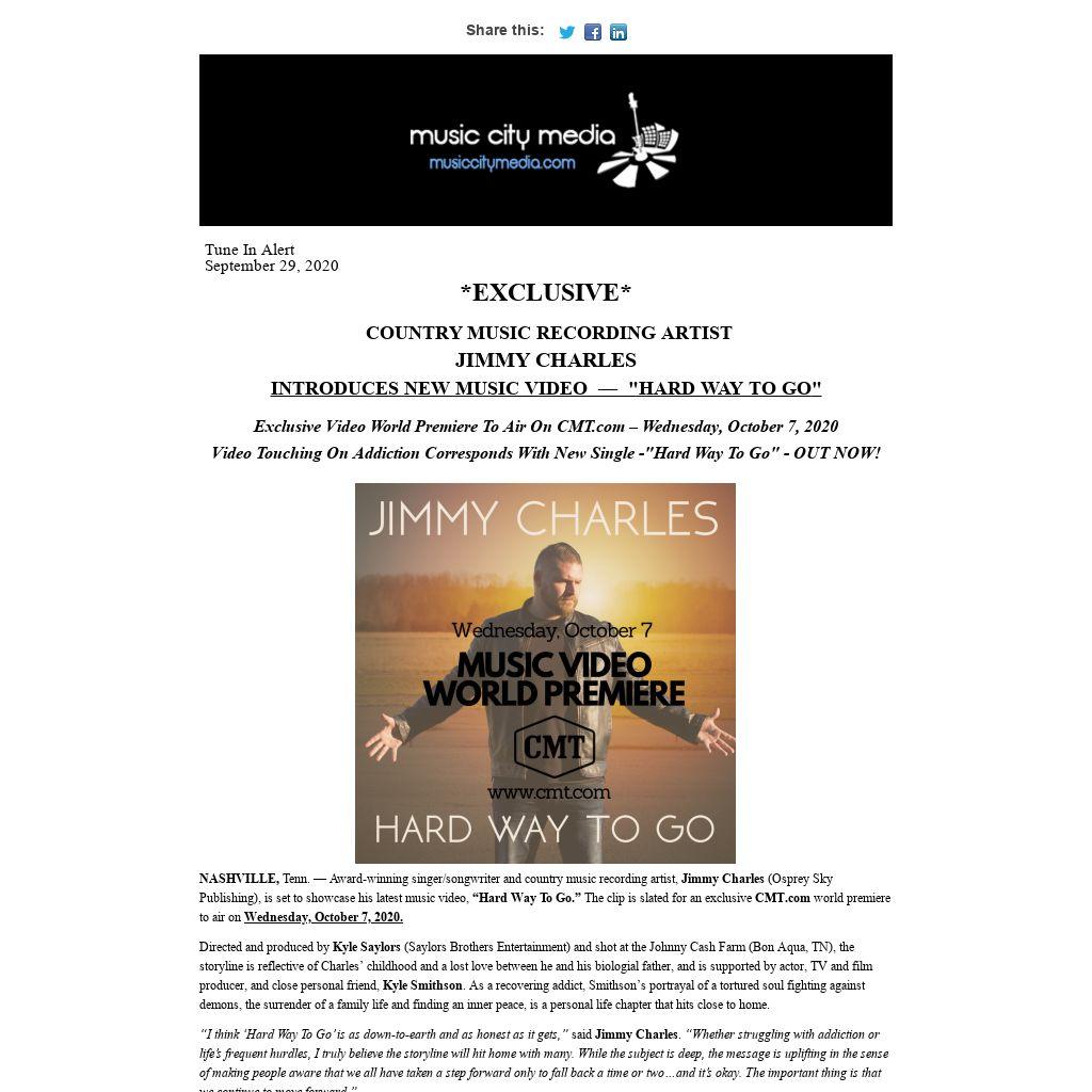 NASHVILLE, Tenn. — Award-winning singer/songwriter and country music recording artist, Jimmy Charles (Osprey Sky Publishing), is set to showcase his latest music video, “Hard Way To Go.” The clip is slated for an exclusive CMT.com world premiere to air on Wednesday, October 7, 2020.