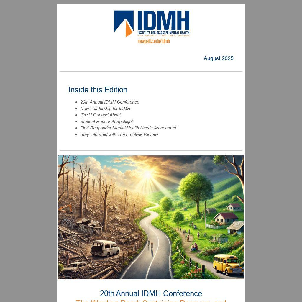 Conference Registration Opens Today - August 4! We’re excited to announce that registration for the 20th Annual IDMH Conference is now open! Don’t miss this opportunity to join first responders, mental health professionals, and community leaders as we explore long-term recovery and resilience in disaster-affected communities. Stay tuned—our full agenda and speaker lineup will be announced soon!