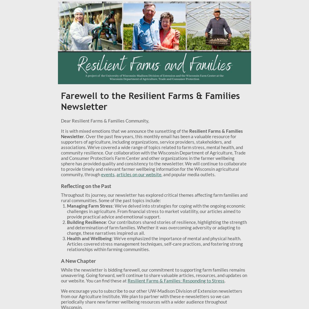 While the newsletter is bidding farewell, our commitment to supporting farm families remains unwavering. Going forward, we’ll continue to share valuable articles, resources, and updates on our website. You can find these at Resilient Farms & Families: Responding to Stress.