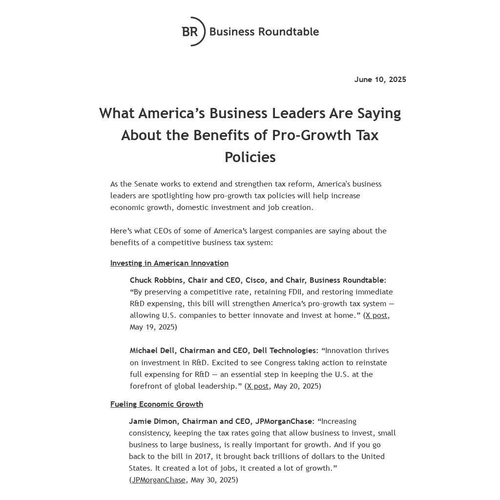 | Chuck Robbins, Chair and CEO, Cisco, and Chair, Business Roundtable: “By preserving a competitive rate, retaining FDII, and restoring immediate R&D expensing, this bill will strengthen America’s pro-growth tax system — allowing U.S. companies to better innovate and invest at home.” (X post, May 19, 2025)