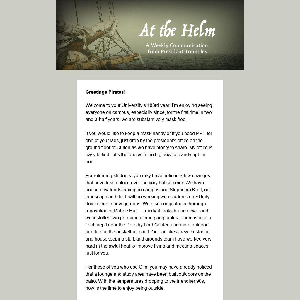 Welcome to your University’s 183rd year! I’m enjoying seeing everyone on campus, especially since, for the first time in two-and-a-half years, we are substantively mask free.