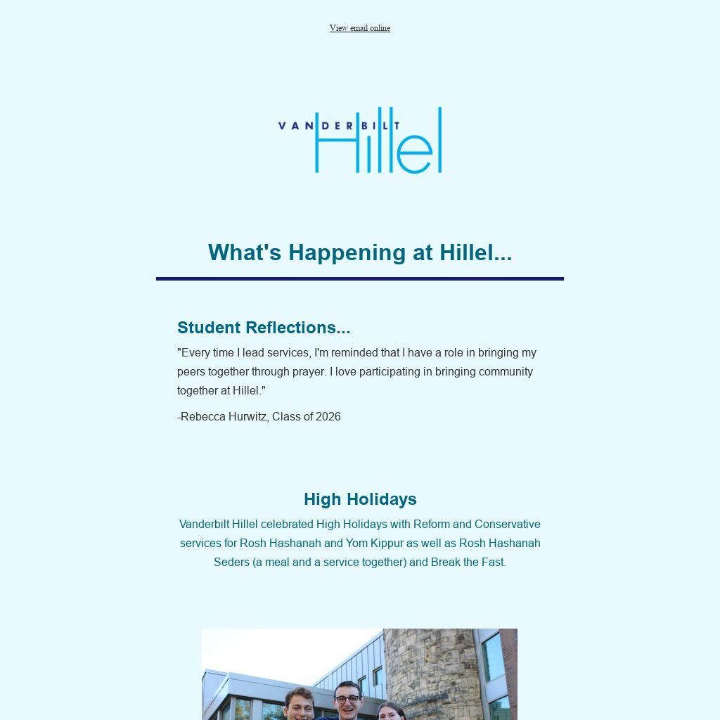 Vanderbilt Hillel celebrated High Holidays with Reform and Conservative services for Rosh Hashanah and Yom Kippur as well as Rosh Hashanah Seders (a meal and a service together) and Break the Fast.