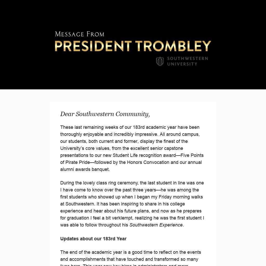 I close by thanking everyone who is part of our community for your goodwill, expertise, and dedication on behalf of Southwestern University and its remarkable students. As authors of the latest chapter in Southwestern’s history, we can look back with pride at our accomplishments, and look forward to the exciting year ahead.