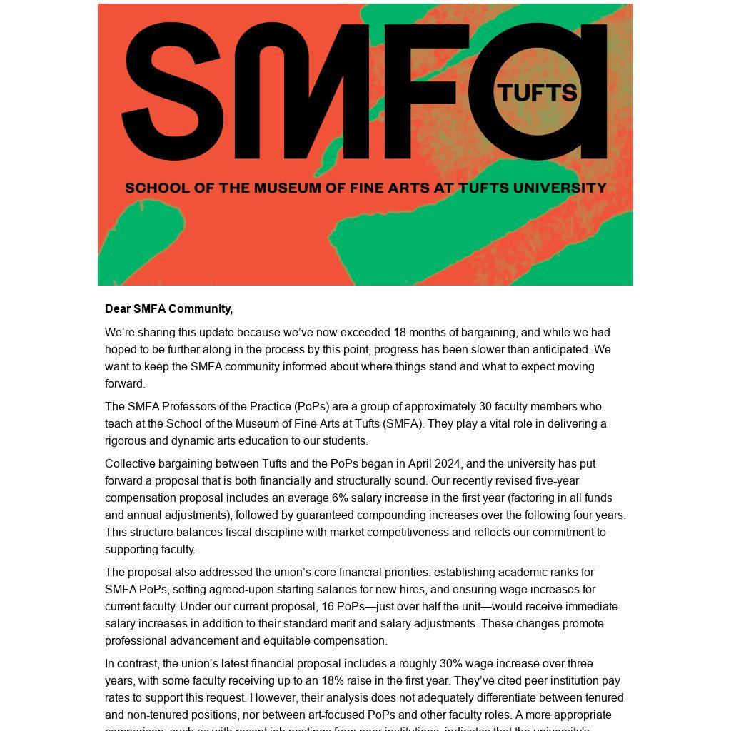 Collective bargaining between Tufts and the PoPs began in April 2024, and the university has put forward a proposal that is both financially and structurally sound. Our recently revised five-year compensation proposal includes an average 6% salary increase in the first year (factoring in all funds and annual adjustments), followed by guaranteed compounding increases over the following four years. This structure balances fiscal discipline with market competitiveness and reflects our commitment to supporting faculty.