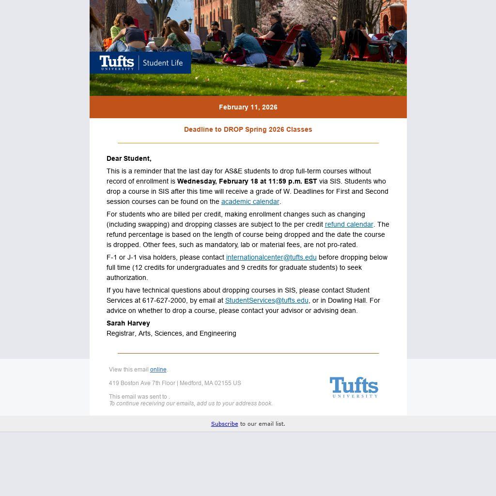 This is a reminder that the last day for AS&E students to drop full-term courses without record of enrollment is Wednesday, February 18 at 11:59 p.m. EST via SIS. Students who drop a course in SIS after this time will receive a grade of W. Deadlines for First and Second session courses can be found on the academic calendar.