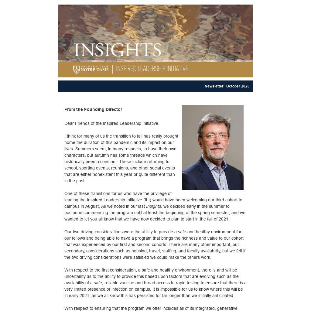 One of these transitions for us who have the privilege of leading the Inspired Leadership Initiative (ILI) would have been welcoming our third cohort to campus in August. As we noted in our last Insights, we decided early in the summer to postpone commencing the program until at least the beginning of the spring semester, and we wanted to let you all know that we have now decided to plan to start in the fall of 2021.