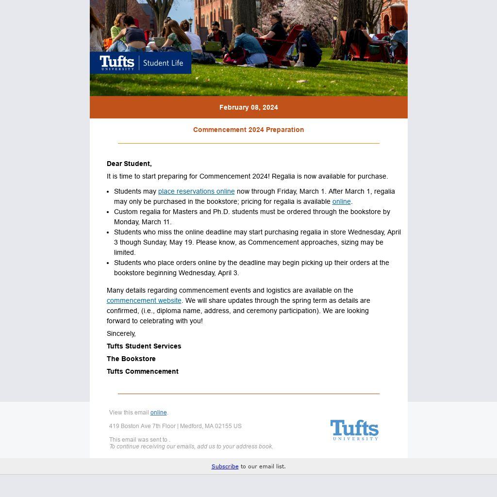 - Custom regalia for Masters and Ph.D. students must be ordered through the bookstore by Monday, March 11.