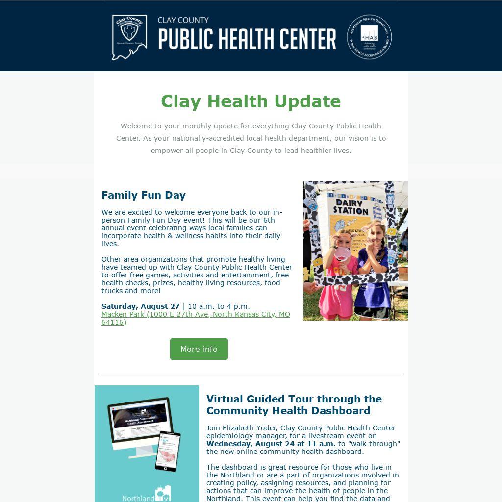 Welcome to your monthly update for everything Clay County Public Health Center. As your nationally-accredited local health department, our vision is to empower all people in Clay County to lead healthier lives.