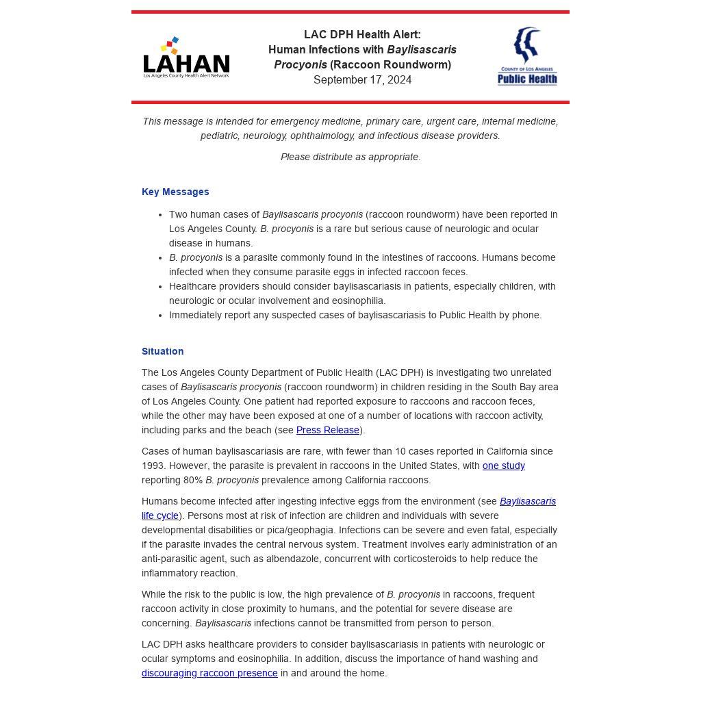 Upon suspicion of baylisascariasis, clinicians should immediately contact LAC DPH Acute Communicable Disease Control (ACDC) who will approve testing, if indicated, and will provide instructions for the testing of serum and CSF by the CDC. Once approved for testing, specimens should be submitted to LAC DPH PHL for processing and transport to CDC.