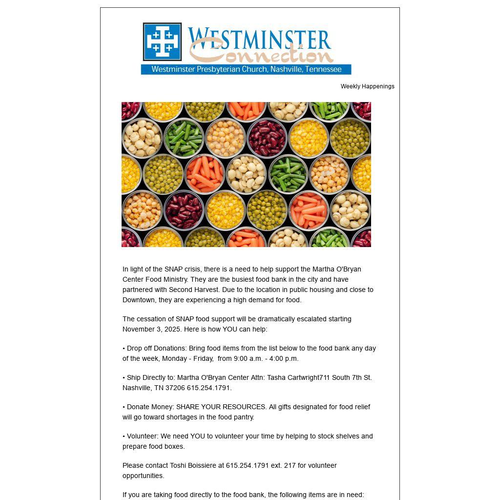 In light of the SNAP crisis, there is a need to help support the Martha O'Bryan Center Food Ministry. They are the busiest food bank in the city and have partnered with Second Harvest. Due to the location in public housing and close to Downtown, they are experiencing a high demand for food.