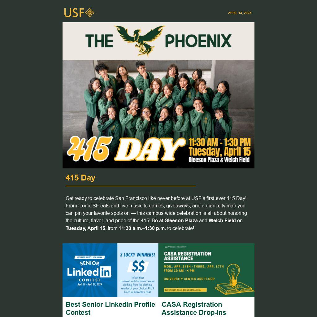 Get ready to celebrate San Francisco like never before at USF’s first-ever 415 Day! From iconic SF eats and live music to games, giveaways, and a giant city map you can pin your favorite spots on — this campus-wide celebration is all about honoring the culture, flavor, and pride of the 415! Be at Gleeson Plaza and Welch Field on Tuesday, April 15, from 11:30 a.m.–1:30 p.m. to celebrate!