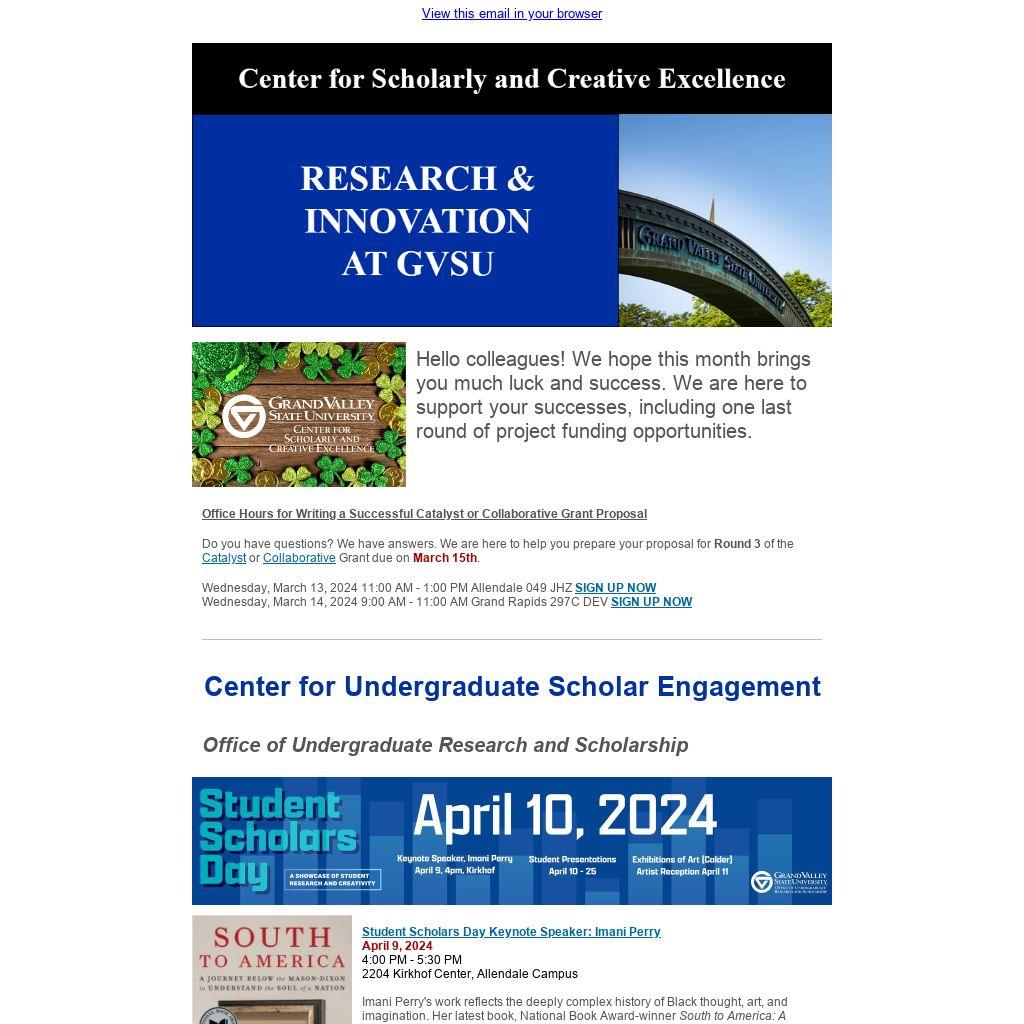 Student Scholars Day (SSD) celebrates scholarship, research, and creative work performed by GVSU students. Beginning as a single-day research symposium almost 30 years ago, SSD evolved into a multi-day event that celebrates the scholarly process and showcases faculty-mentored student work. Student presentations will be on Wednesday, April 10, 2024.