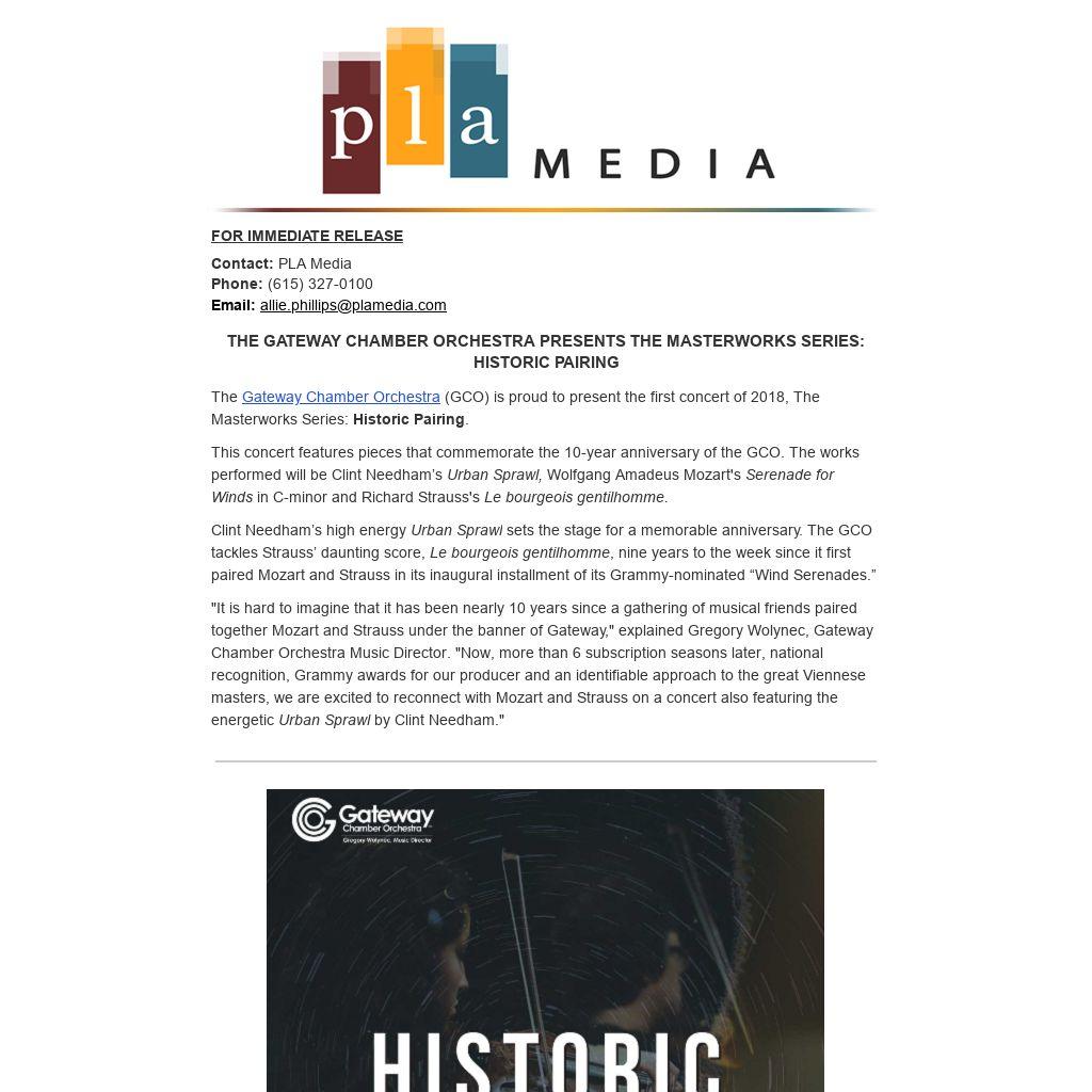 "It is hard to imagine that it has been nearly 10 years since a gathering of musical friends paired together Mozart and Strauss under the banner of Gateway," explained Gregory Wolynec, Gateway Chamber Orchestra Music Director. "Now, more than 6 subscription seasons later, national recognition, Grammy awards for our producer and an identifiable approach to the great Viennese masters, we are excited to reconnect with Mozart and Strauss on a concert also featuring the energetic Urban Sprawl by Clint Needham."