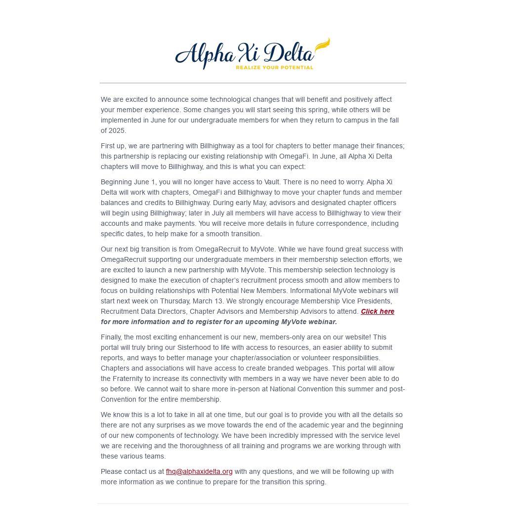 This message was sent to the following audiences: Past National Presidents, National Council, Alpha Xi Delta Foundation Board of Trustees, National Housing Corporation, Committee on Leadership, NPC Delegation, National Directors Network, Special Appointees, Area Facilitators,Territory Directors, Chapter Development Specialists, Chapter Advisors, Finance and Operations Advisors, Membership Advisors, Chapter Presidents, Finance and Operations Vice Presidents, Membership Vice Presidents, Recruitment Data Directors, Recruitment Events Director, COB Director, Recruitment 365 Directors, Alumnae Association Presidents, and Fraternity staff.