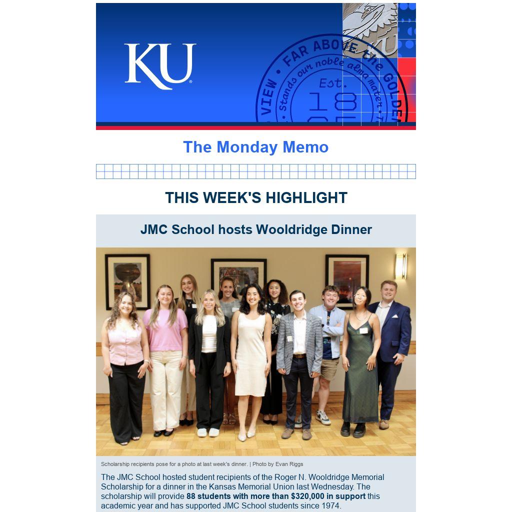 The JMC School hosted student recipients of the Roger N. Wooldridge Memorial Scholarship for a dinner in the Kansas Memorial Union last Wednesday. The scholarship will provide 88 students with more than $320,000 in support this academic year and has supported JMC School students since 1974.