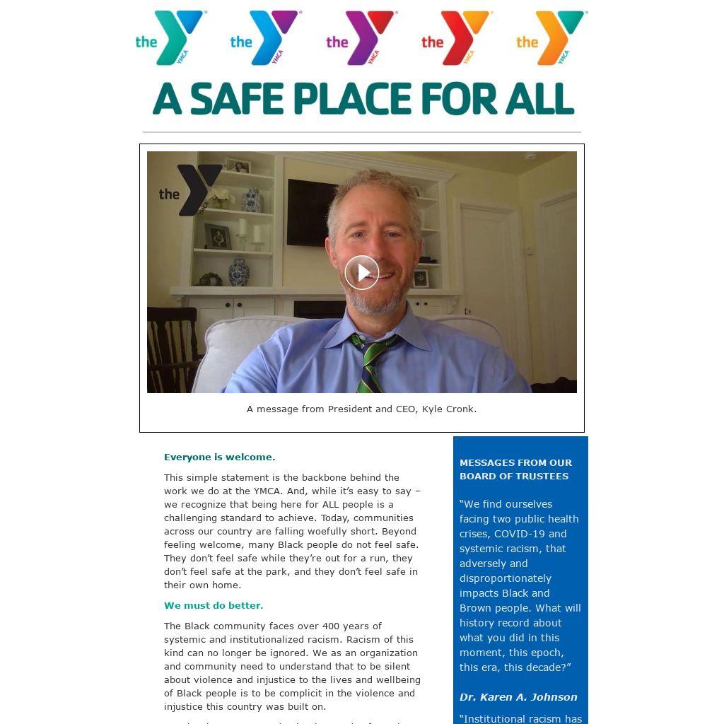 This simple statement is the backbone behind the work we do at the YMCA. And, while it’s easy to say – we recognize that being here for ALL people is a challenging standard to achieve. Today, communities across our country are falling woefully short. Beyond feeling welcome, many Black people do not feel safe. They don’t feel safe while they’re out for a run, they don’t feel safe at the park, and they don’t feel safe in their own home.