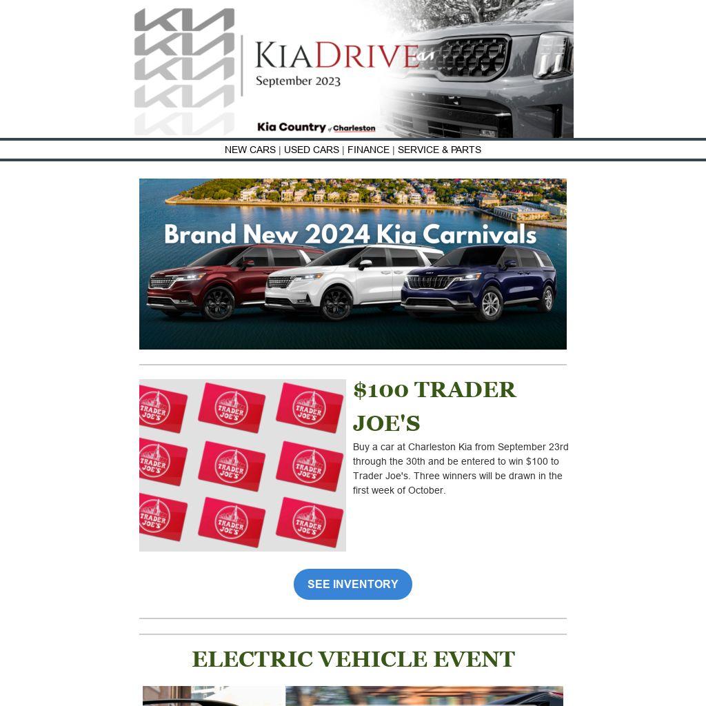 Buy a car at Charleston Kia from September 23rd through the 30th and be entered to win $100 to Trader Joe's. Three winners will be drawn in the first week of October.