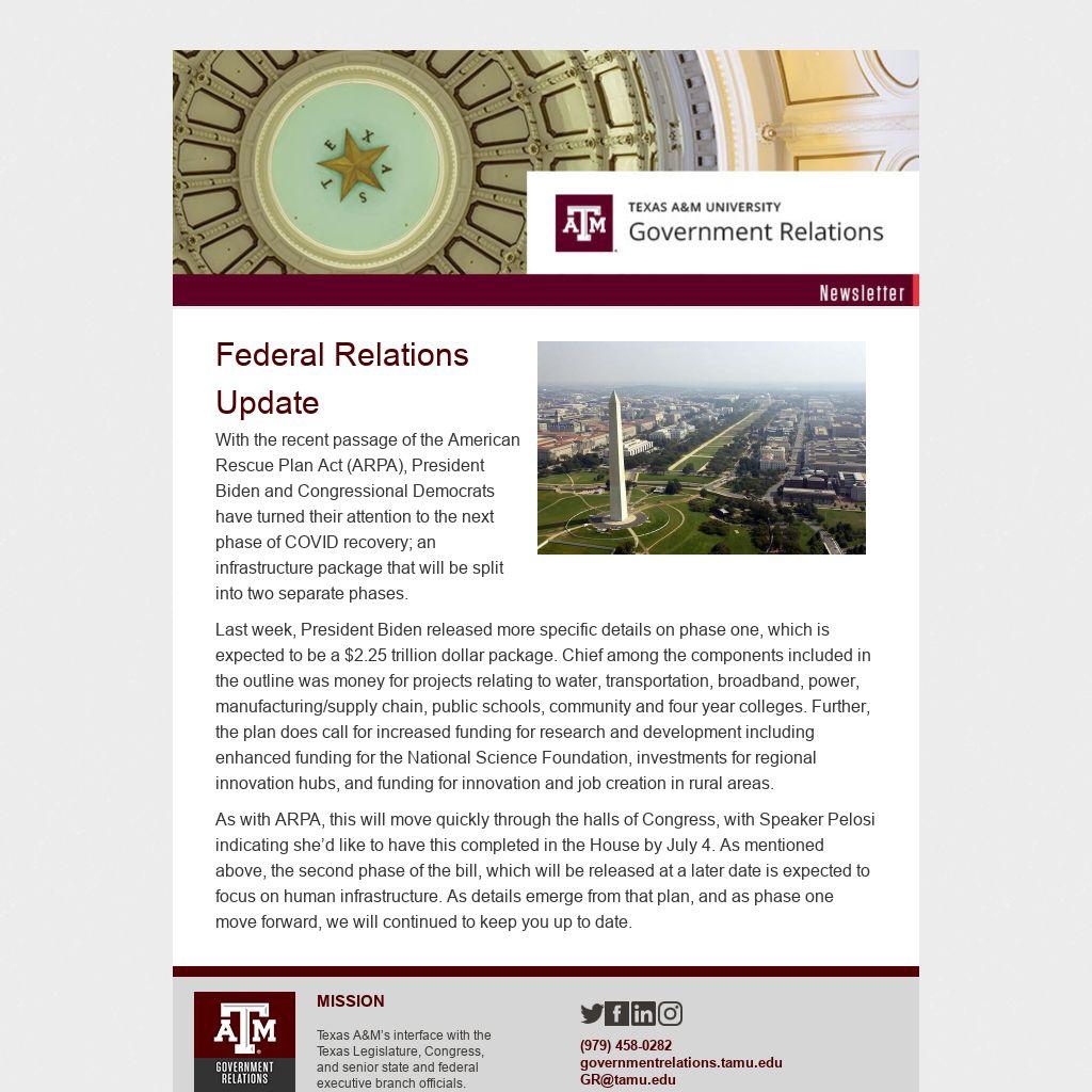 Last week, President Biden released more specific details on phase one, which is expected to be a $2.25 trillion dollar package. Chief among the components included in the outline was money for projects relating to water, transportation, broadband, power, manufacturing/supply chain, public schools, community and four year colleges. Further, the plan does call for increased funding for research and development including enhanced funding for the National Science Foundation, investments for regional innovation hubs, and funding for innovation and job creation in rural areas.