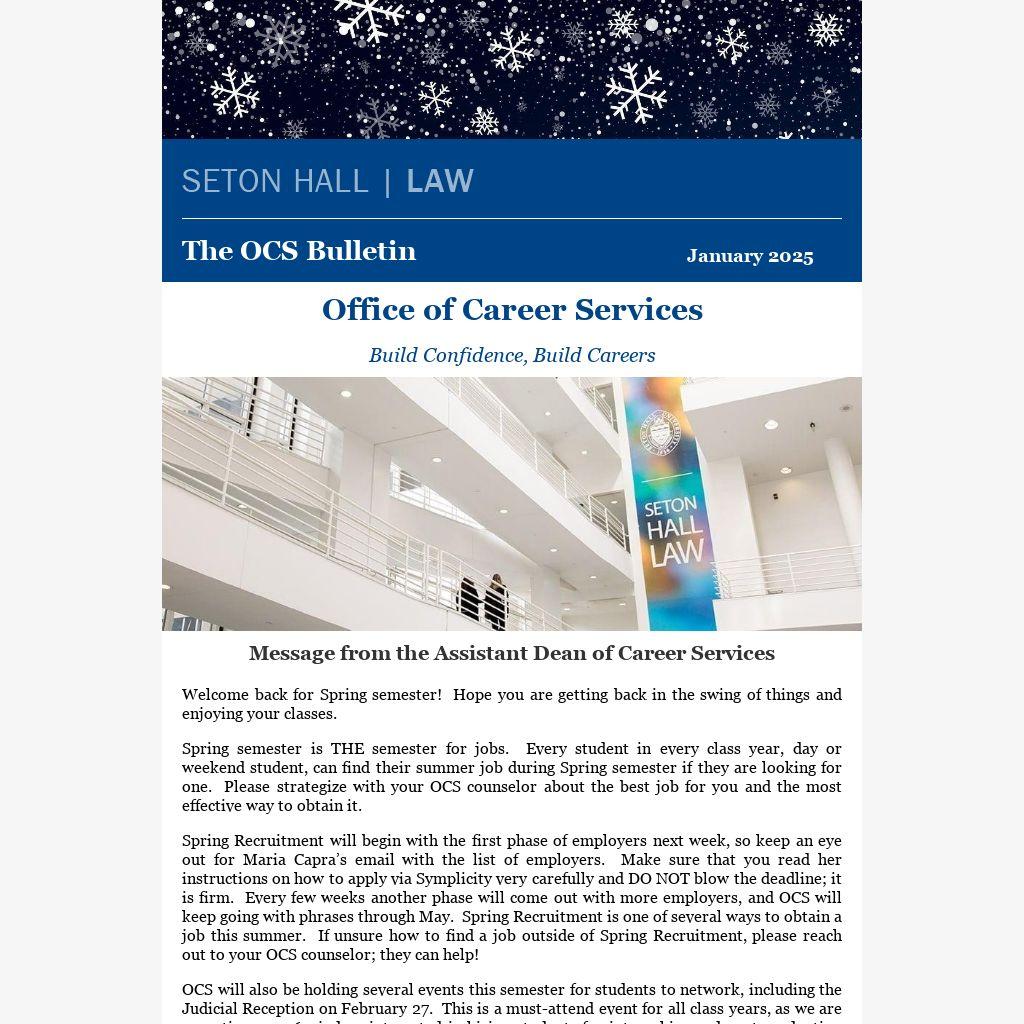 OCS will also be holding several events this semester for students to network, including the Judicial Reception on February 27. This is a must-attend event for all class years, as we are expecting over 60 judges interested in hiring students for internships and post-graduation clerkships. We will also hold information sessions for clerkship recruitment and Fall Recruitment, which we also highly recommend. You can reserve your spot for all events on Symplicity under “Events.”
