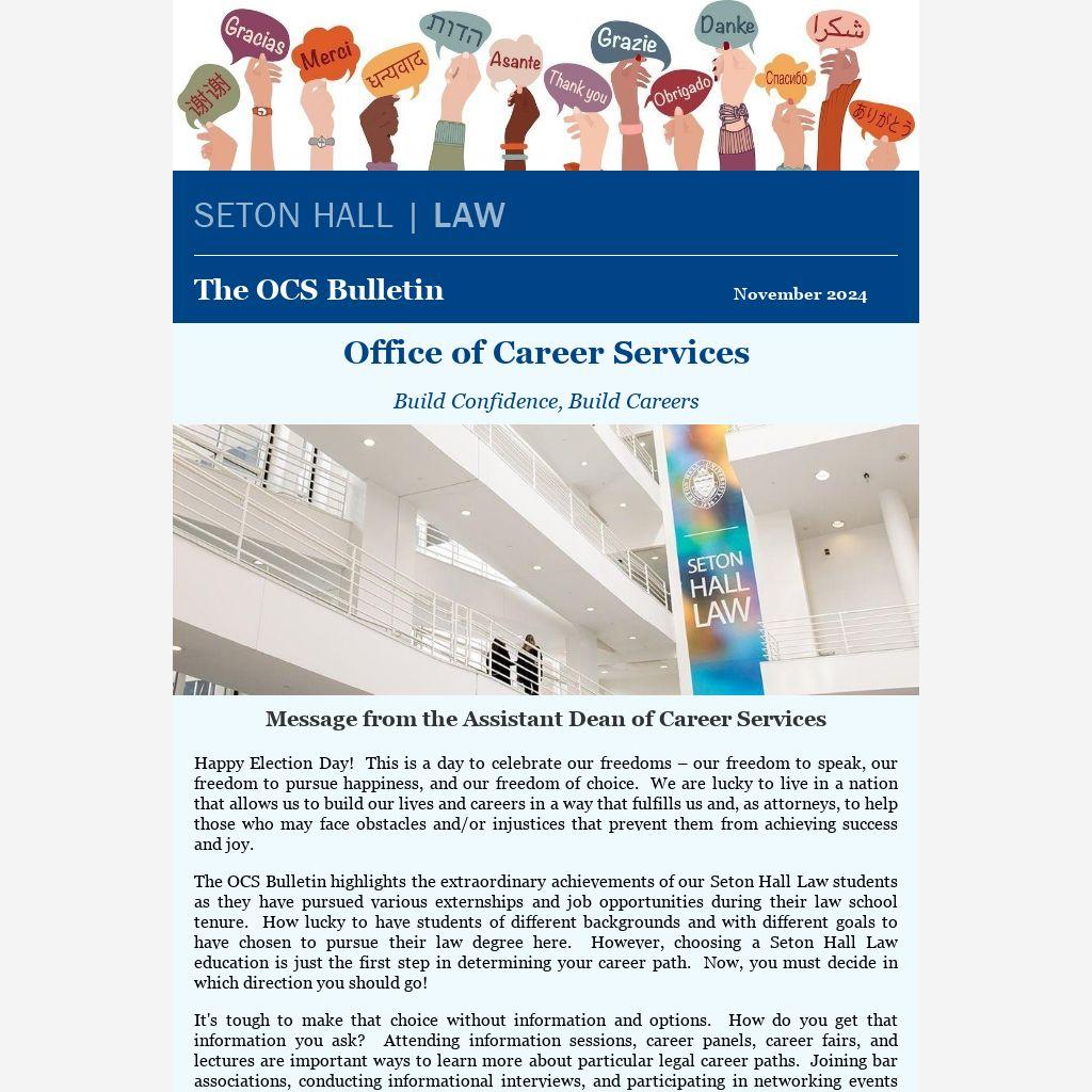 The OCS Bulletin highlights the extraordinary achievements of our Seton Hall Law students as they have pursued various externships and job opportunities during their law school tenure. How lucky to have students of different backgrounds and with different goals to have chosen to pursue their law degree here. However, choosing a Seton Hall Law education is just the first step in determining your career path. Now, you must decide in which direction you should go!