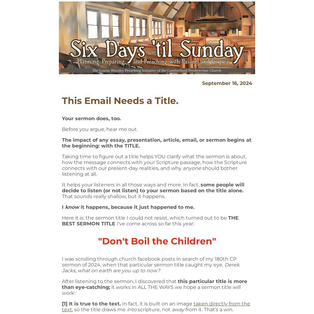 This week, dear preachers, I'll be praying that God guides you toward a sermon title that provides focus for your work, deepens your listeners' connection to the Word and to the message, and has meaningful impact beyond Sunday morning.