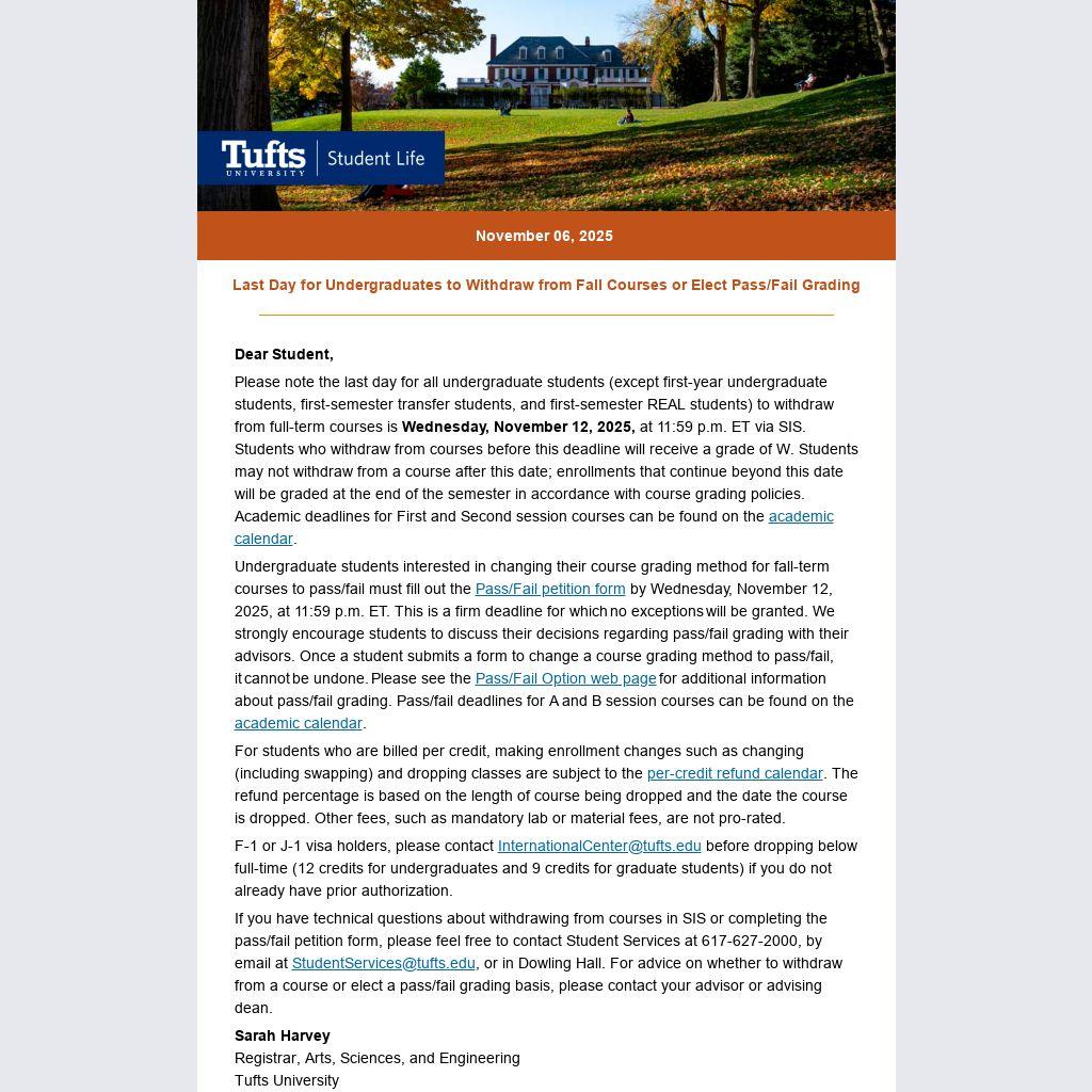 If you have technical questions about withdrawing from courses in SIS or completing the pass/fail petition form, please feel free to contact Student Services at 617-627-2000, by email at StudentServices@tufts.edu, or in Dowling Hall. For advice on whether to withdraw from a course or elect a pass/fail grading basis, please contact your advisor or advising dean.
