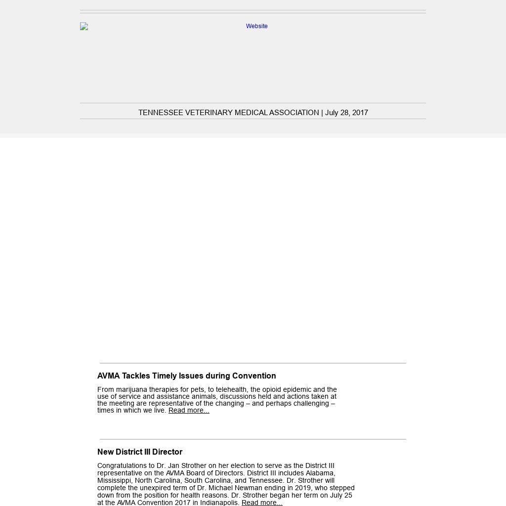 | New District III Director Congratulations to Dr. Jan Strother on her election to serve as the District III representative on the AVMA Board of Directors. District III includes Alabama, Mississippi, North Carolina, South Carolina, and Tennessee. Dr. Strother will complete the unexpired term of Dr. Michael Newman ending in 2019, who stepped down from the position for health reasons. Dr. Strother began her term on July 25 at the AVMA Convention 2017 in Indianapolis. Read more...