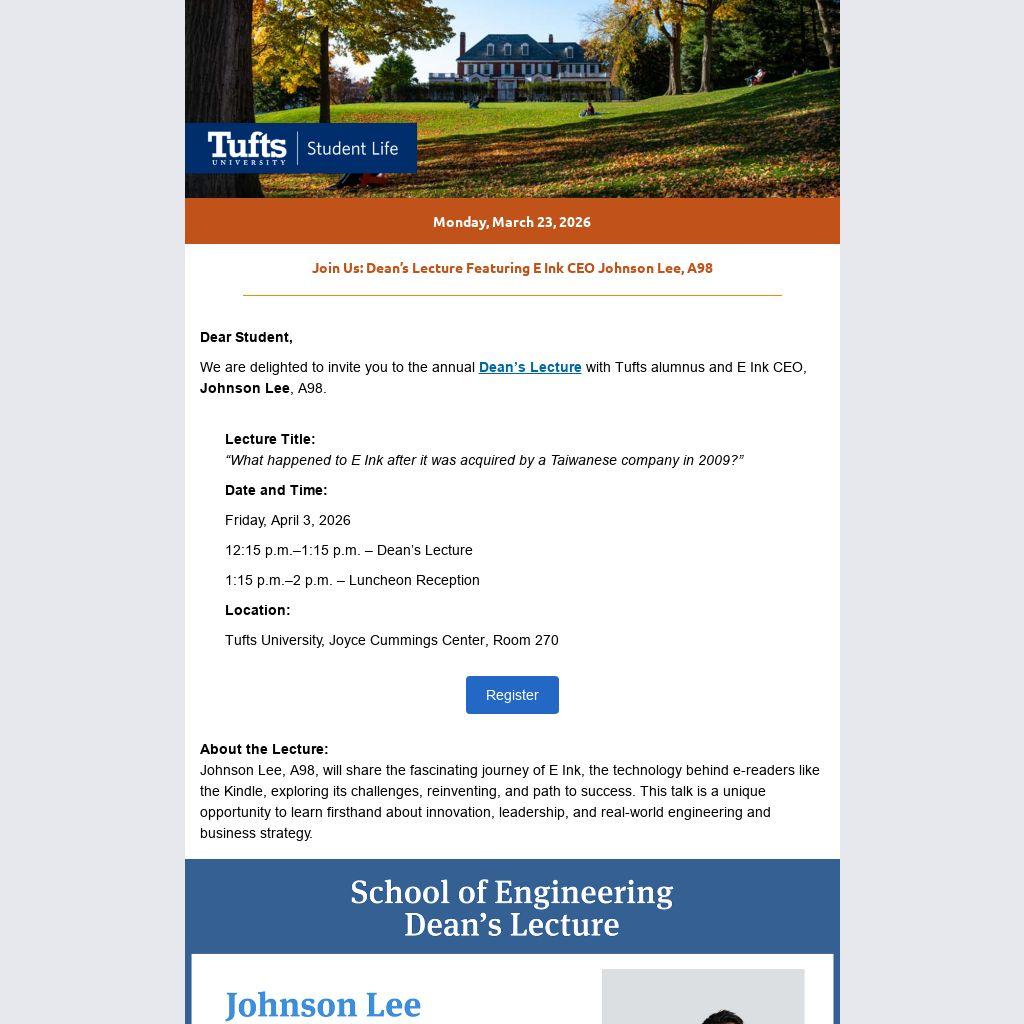Each year, Dean Kyongbum Lee invites prominent guest speakers to deliver Dean's Lectures on the Tufts campus. Invited speakers are at the tops of their respective fields. Speakers have addressed the School of Engineering and the full Tufts community on topics like creating and unlocking value in an Internet-of-Things world, finding one's career path as a Tufts alum, and lessons learned as a successful entrepreneur.