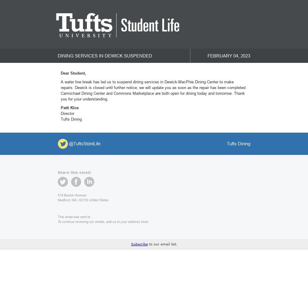 A water line break has led us to suspend dining services in Dewick-MacPhie Dining Center to make repairs. Dewick is closed until further notice; we will update you as soon as the repair has been completed. Carmichael Dining Center and Commons Marketplace are both open for dining today and tomorrow. Thank you for your understanding.