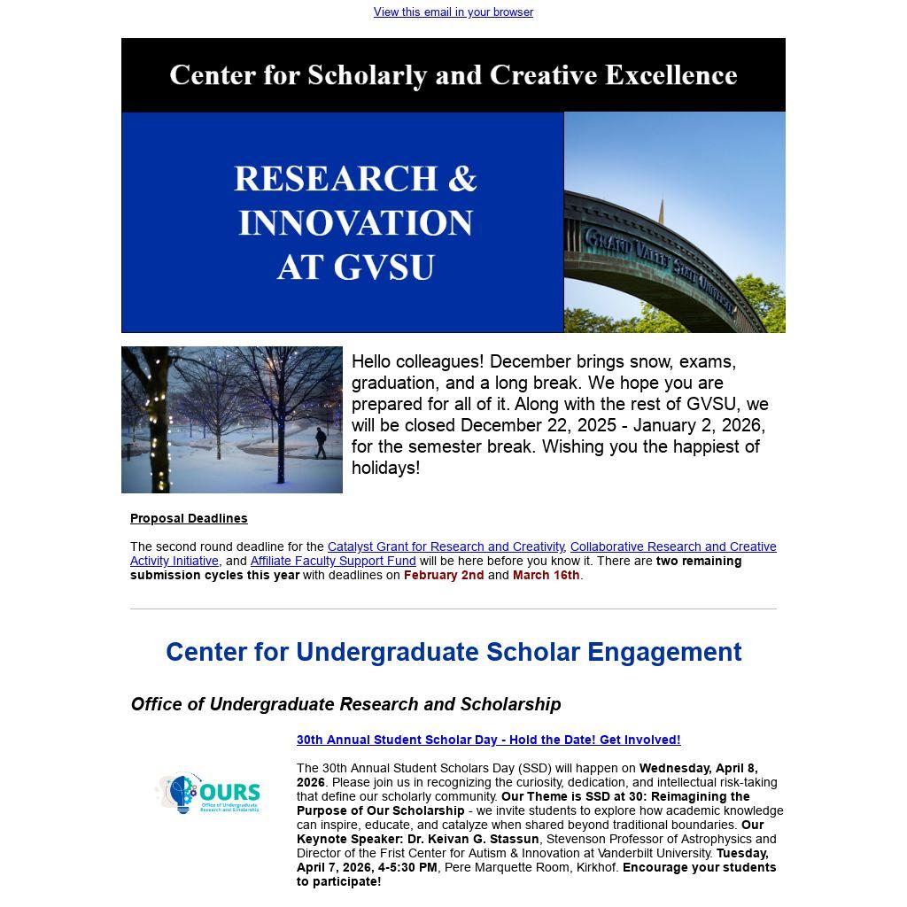 Hello colleagues! December brings snow, exams, graduation, and a long break. We hope you are prepared for all of it. Along with the rest of GVSU, we will be closed December 22, 2025 - January 2, 2026, for the semester break. Wishing you the happiest of holidays!