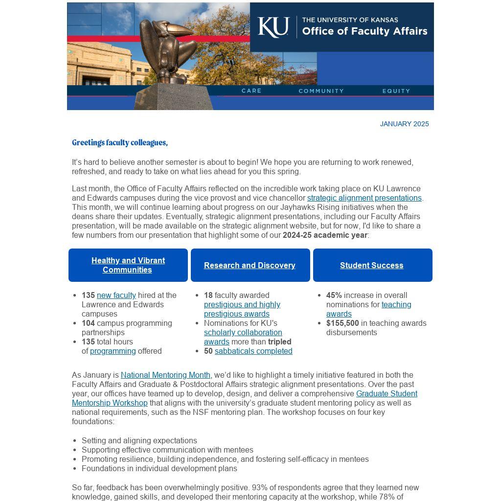 Last month, the Office of Faculty Affairs reflected on the incredible work taking place on KU Lawrence and Edwards campuses during the vice provost and vice chancellor strategic alignment presentations. This month, we will continue learning about progress on our Jayhawks Rising initiatives when the deans share their updates. Eventually, strategic alignment presentations, including our Faculty Affairs presentation, will be made available on the strategic alignment website, but for now, I'd like to share a few numbers from our presentation that highlight some of our 2024-25 academic year: