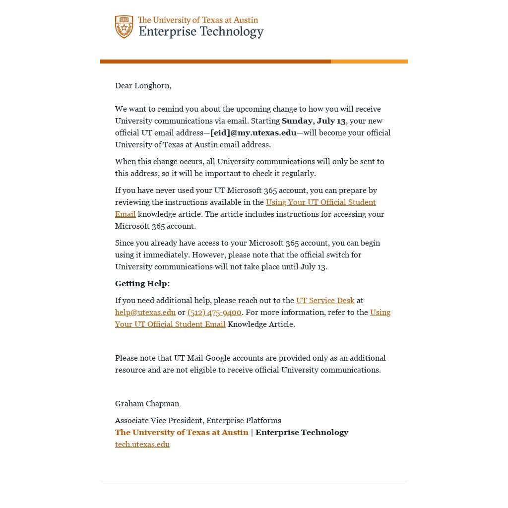 We want to remind you about the upcoming change to how you will receive University communications via email. Starting Sunday, July 13, your new official UT email address—[eid]@my.utexas.edu—will become your official University of Texas at Austin email address.
